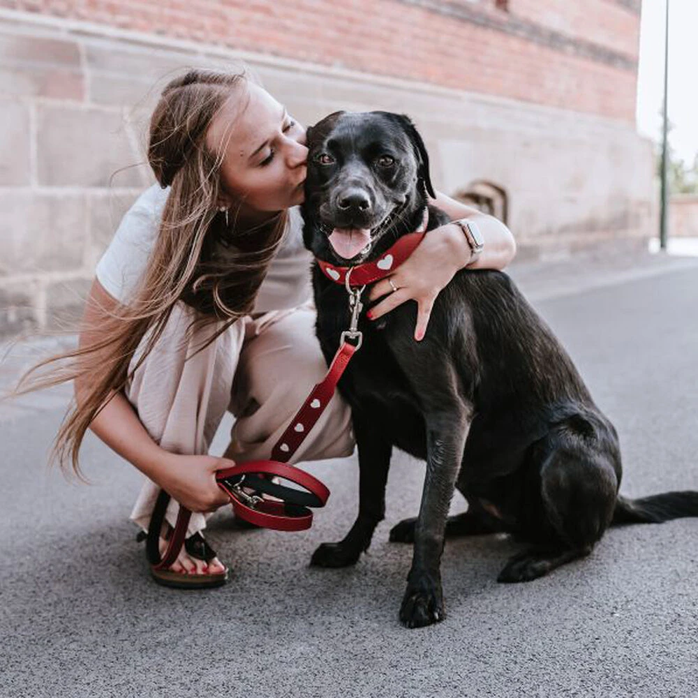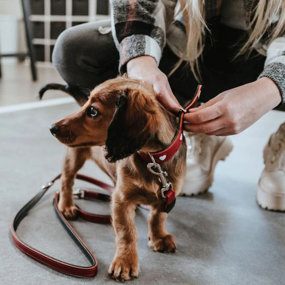 De Love driedubbel verstelbare lijn is een ware parel die uw liefde voor uw hond uitdrukt bij elke wandeling. De lengte kan moeiteloos aangepast worden aan verschillende situaties; kort wanneer u door stedelijke straten loopt, of langer tijdens ontspannen wandelingen in het park. De riem ligt heerlijk in de hand dankzij het zachte nappaleer eronder. De slim geplaatste naden en de ingebouwde karabijnhaken en ringen zijn het bewijs van oog voor detail. De hartvormige elementen, stuk voor stuk met liefde bevestigd, vormen het kenmerk van de Love trainingslijn. Let wel op, de leersoorten worden zo zorgvuldig mogelijk gemaakt. Bij geverfd leer kan er in het begin enige lichte verkleuring optreden.