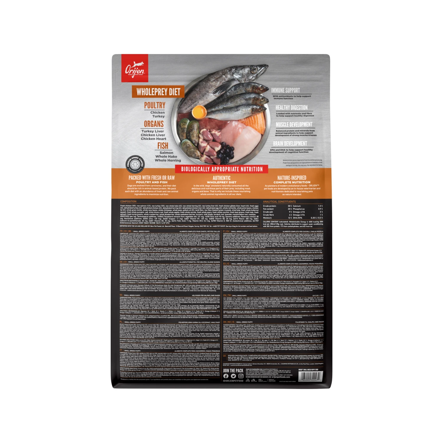 Orijen Puppy Small Breed is speciaal voor kleine viervoeters en bevat 85% dierlijke ingrediënten van hoge kwaliteit. Dit draagt bij aan de spierontwikkeling en geeft een voldaan gevoel. Daarnaast bevat het voer ook veel vezels uit verse groenten en fruit, wat de spijsvertering ondersteund. De antioxidanten uit de bosbessen, veenbessen en plantaardige stoffen helpen het immuunsysteem van je kleine viervoeter.
