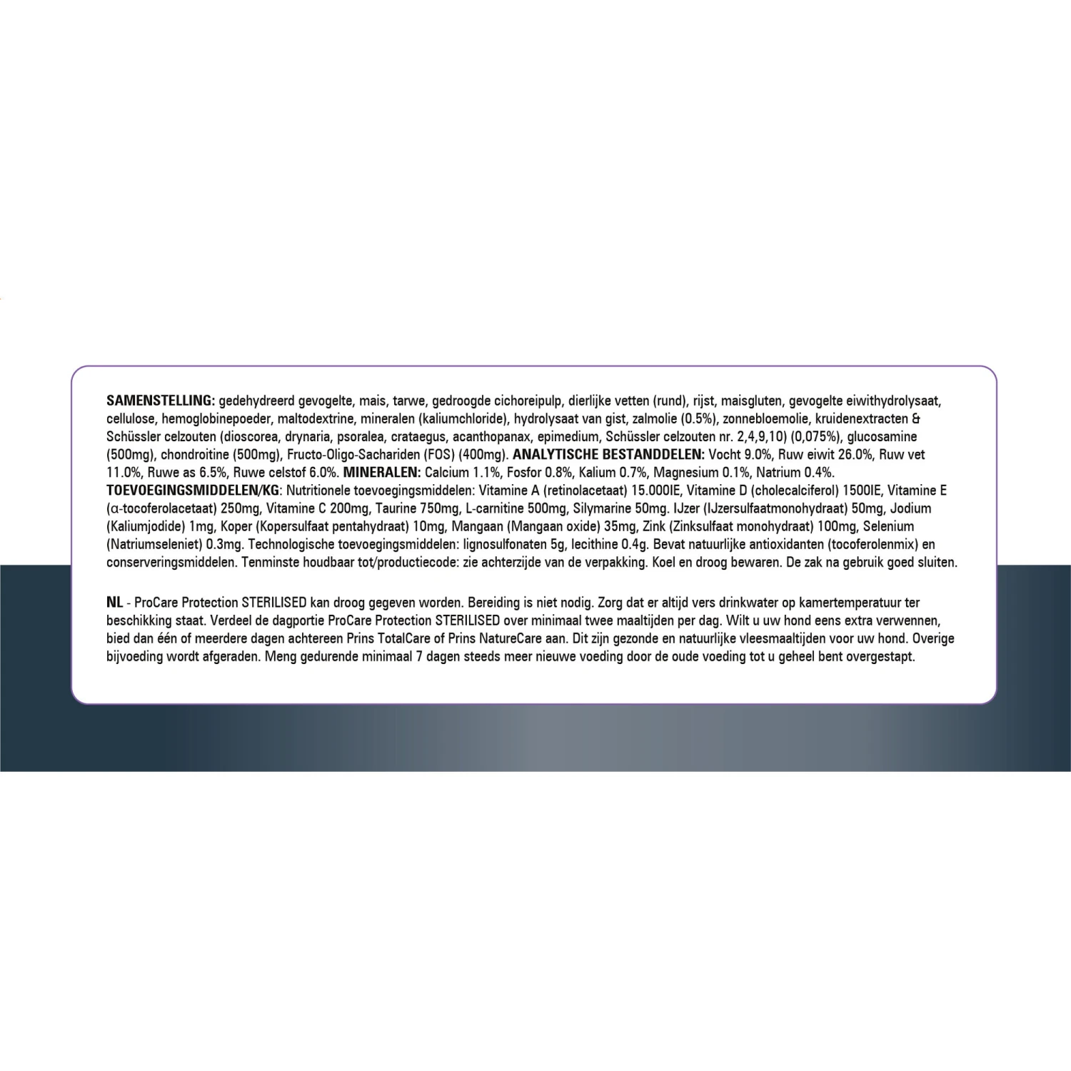 Honden die gesteriliseerd of gecastreerd zijn hebben vaak de neiging om aan te komen in het gewicht. De ProCare Protection Sterilised van Prins bevat een aangepast energiegehalte om uw hond te helpen op een gezond gewicht te blijven. De voeding kan ook goed gegeven worden als uw hond niet is gecastreerd/gesteriliseerd maar wel een lagere energiebehoefte heeft met neiging tot overgewicht. De extra voedingsvezels zullen zorgen voor een vol/verzadigd gevoel om zo het gezonde gewicht van de hond te handhaven. Voor de juiste ondersteuning van het lichaam zijn ingrediënten als zalmolie, FOS, kruidenextracten en Schüssler celzouten, glucosamine en chondroïtine toegevoegd.