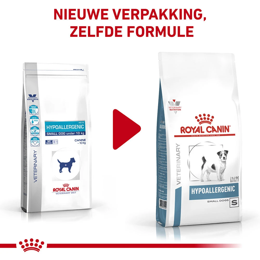 Voedselovergevoeligheid ontstaat wanneer een hond of kat overgevoelig is voor een bepaald bestanddeel in de voeding. Het bestanddeel in de voeding waar het dier overgevoelig op reageert wordt het allergeen genoemd. Bij de behandeling van voedselovergevoeligheid zal uw dierenarts uw hond een speciale dieetvoeding zoals Royal Canin Hypoallergenic hond voorschrijven. Deze voeding heeft een kleine brokgrootte en is geschikt voor kleine honden tot 10 kg.