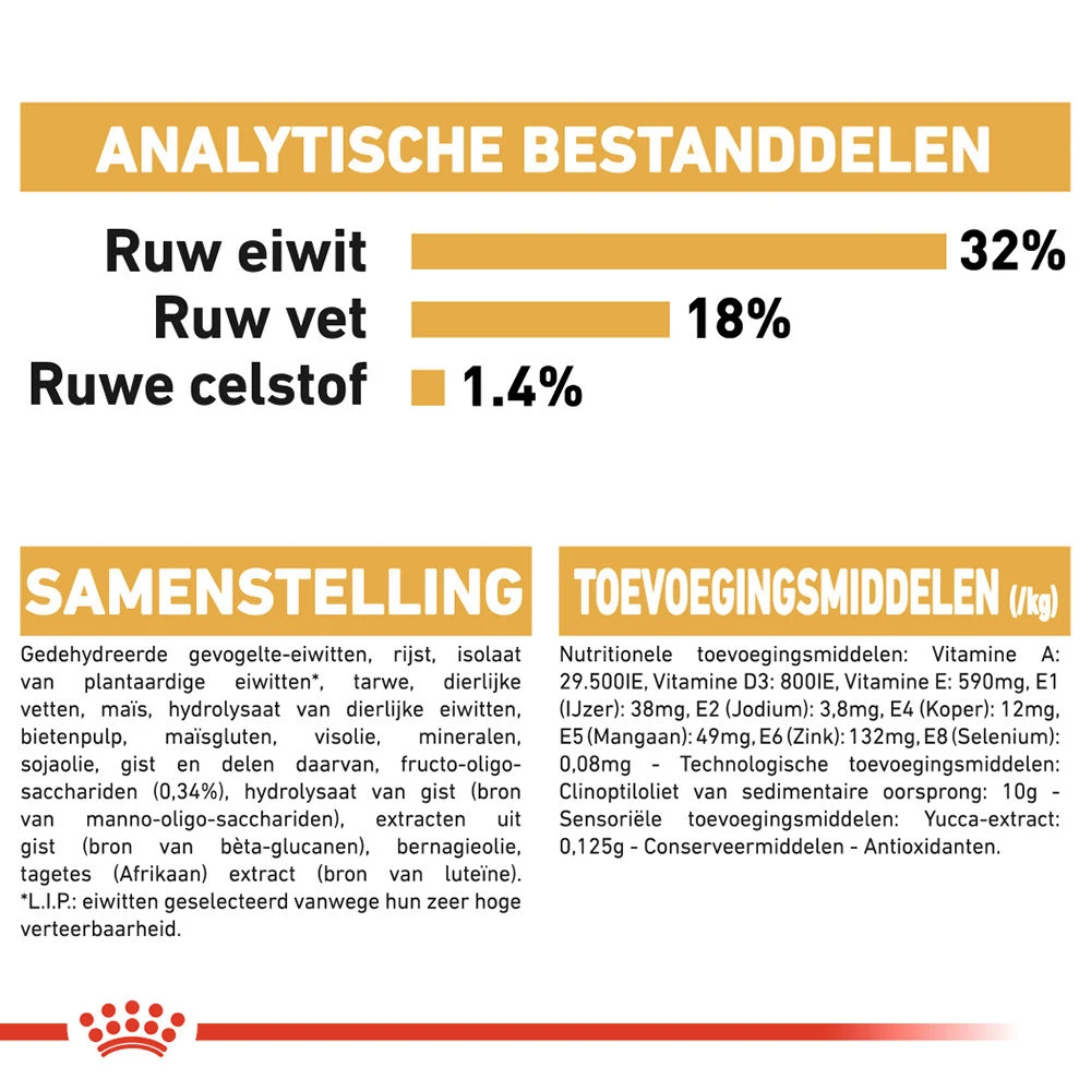 Gedehydreerde gevogelte-eiwitten, rijst, isolaat van plantaardige eiwitten*, tarwe, dierlijke vetten, maïs, hydrolysaat van dierlijke eiwitten, bietenpulp, maïsgluten, mineralen, visolie, sojaolie, gist, Fructo-Oligo-Sacchariden, hydrolysaat van gist (bron van Manno-Oligo-Sacchariden), bernagieolie, tagetes (Afrikaan) extract (bron van luteïne)