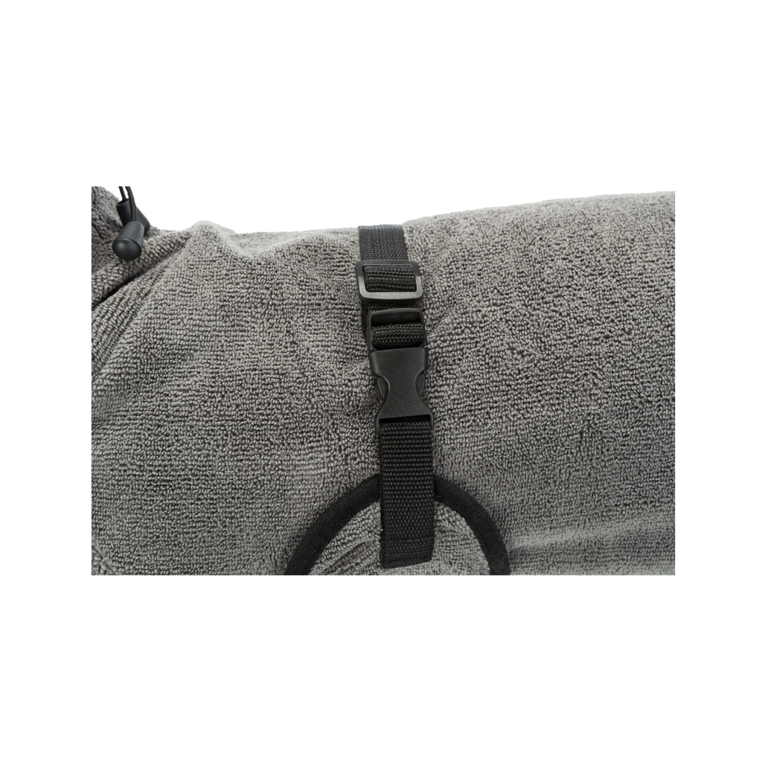 Deze lekkere zachte en warme badjas van Trixie houdt uw hond warm en beschermt hem tegen onderkoeling. De badstof badjas is gemaakt van polyester en katoen en is gemakkelijk aan te trekken door de drukknopen aan de achterkant. In de hals van de badjas zit een elastisch trekkoord zodat deze goed aansluit. Met de borstflap en verstelbare buikriem meet u altijd een perfecte pasvorm aan.
